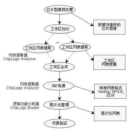 在芯片反向设计中,网表/电路图的提取是个很大的课题,网表提取的质量和速度直接影响后续整理、仿真、LVS等方方面面的工作。我们在总结众多成功案例的基础上,依托自主研发的软件应用,可准确、快速、高质量地进行网表/电路图的提取。
